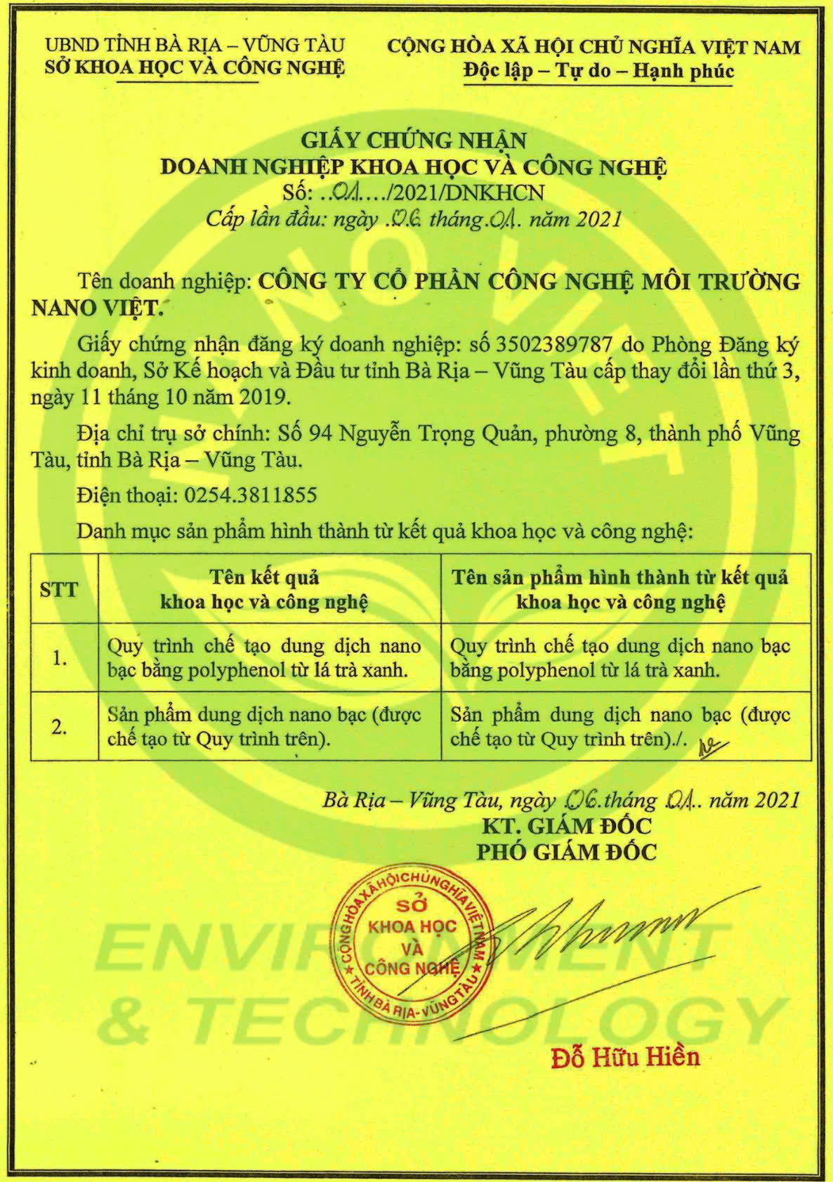 Giấy chứng nhận công nghệ độc quyền của Nano Việt