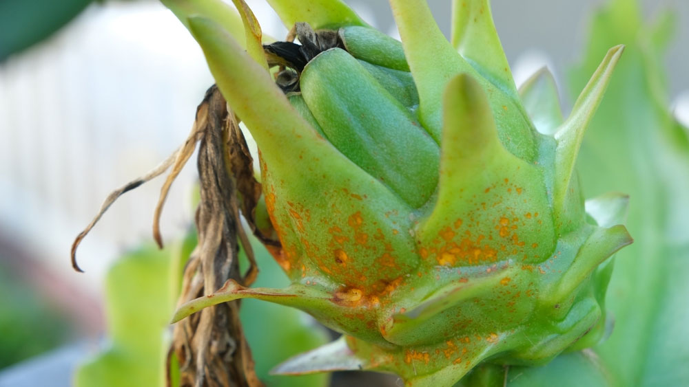 Nguyên nhân: Bệnh rỉ sắt là một vấn đề thường gặp trên cây thanh long trong mùa mưa, thường do nấm Phakopsora spp. gây ra. Loại bệnh này phát triển mạnh khi độ ẩm không khí cao và mưa kéo dài, tạo điều kiện lý tưởng cho bào tử nấm lan rộng, đặc biệt ở các vườn thiếu thông thoáng.