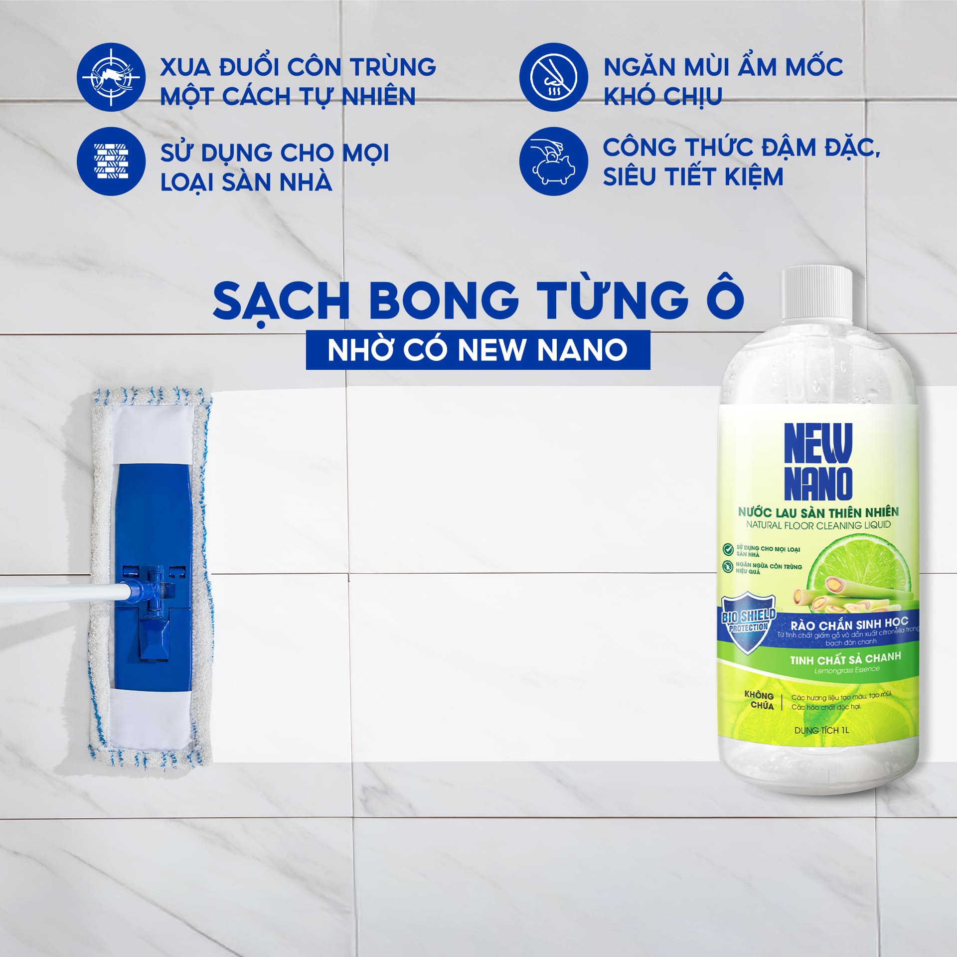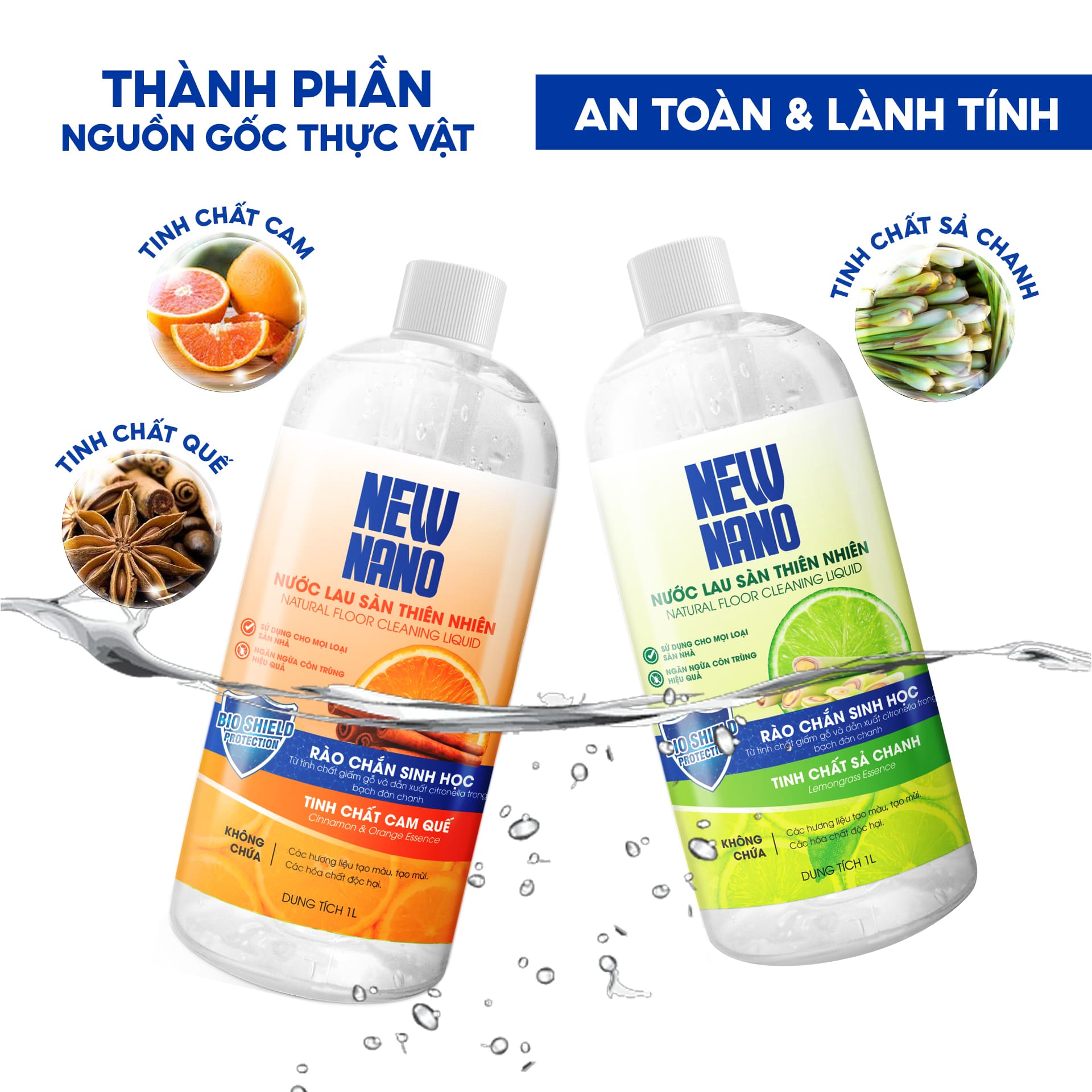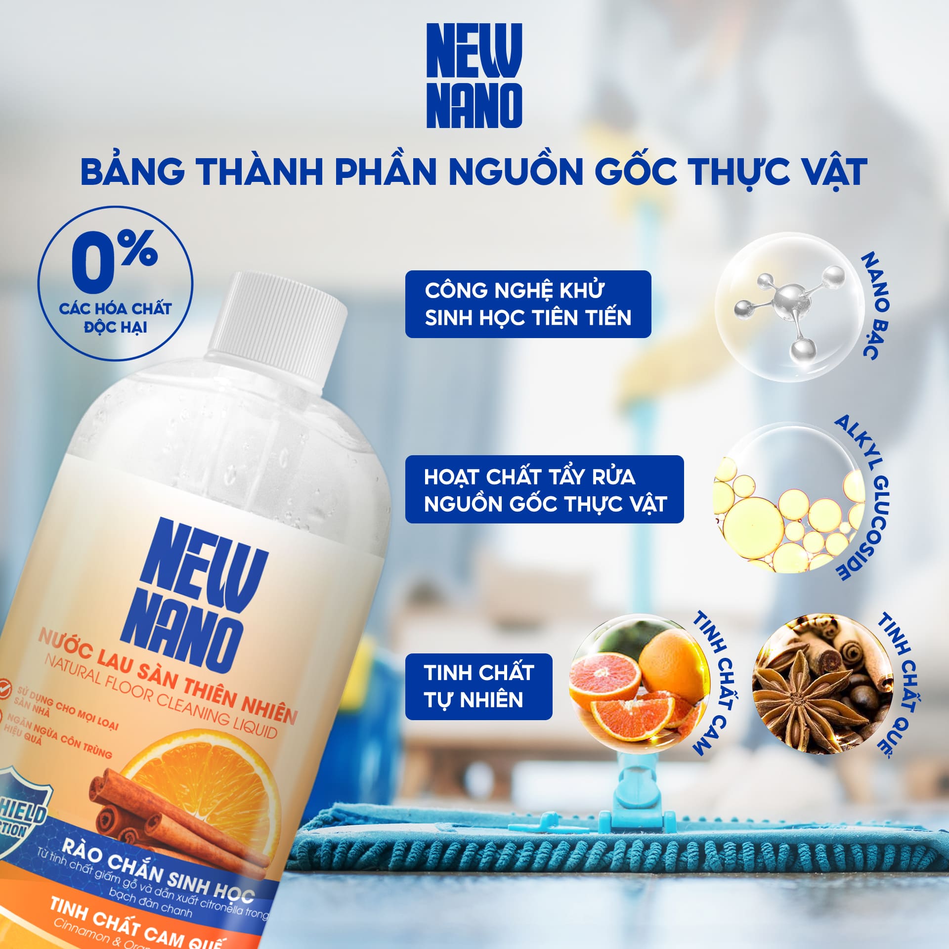 Nước lau sàn New Nano được sản xuất từ các thành phần thiên nhiên, an toàn cho người sử dụng và thân thiện với môi trường, đặc biệt giúp làm sạch hiệu quả và bảo vệ bề mặt sàn nhà.