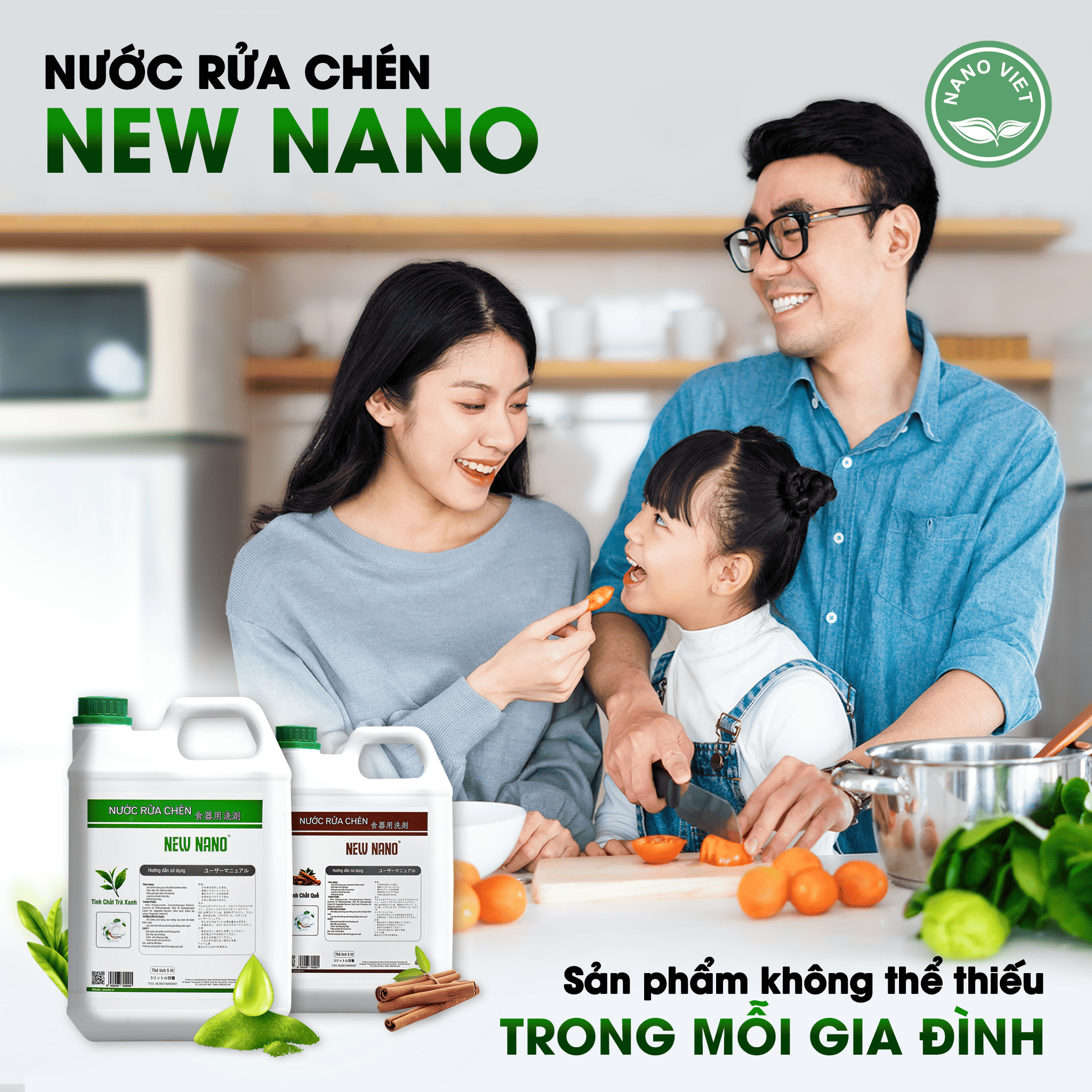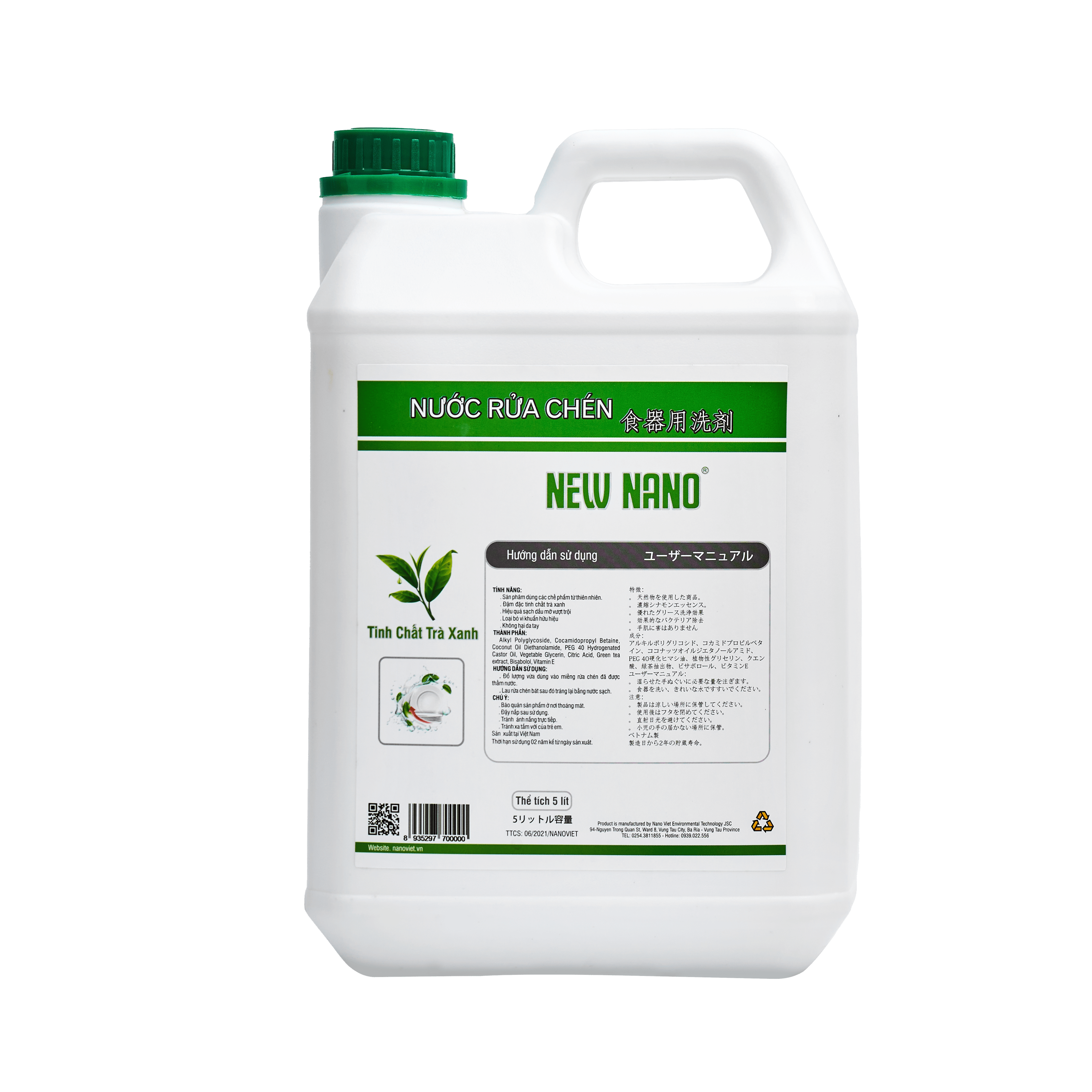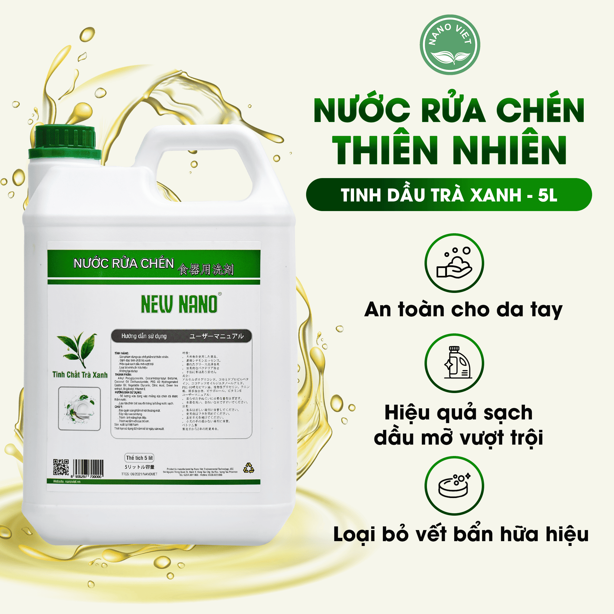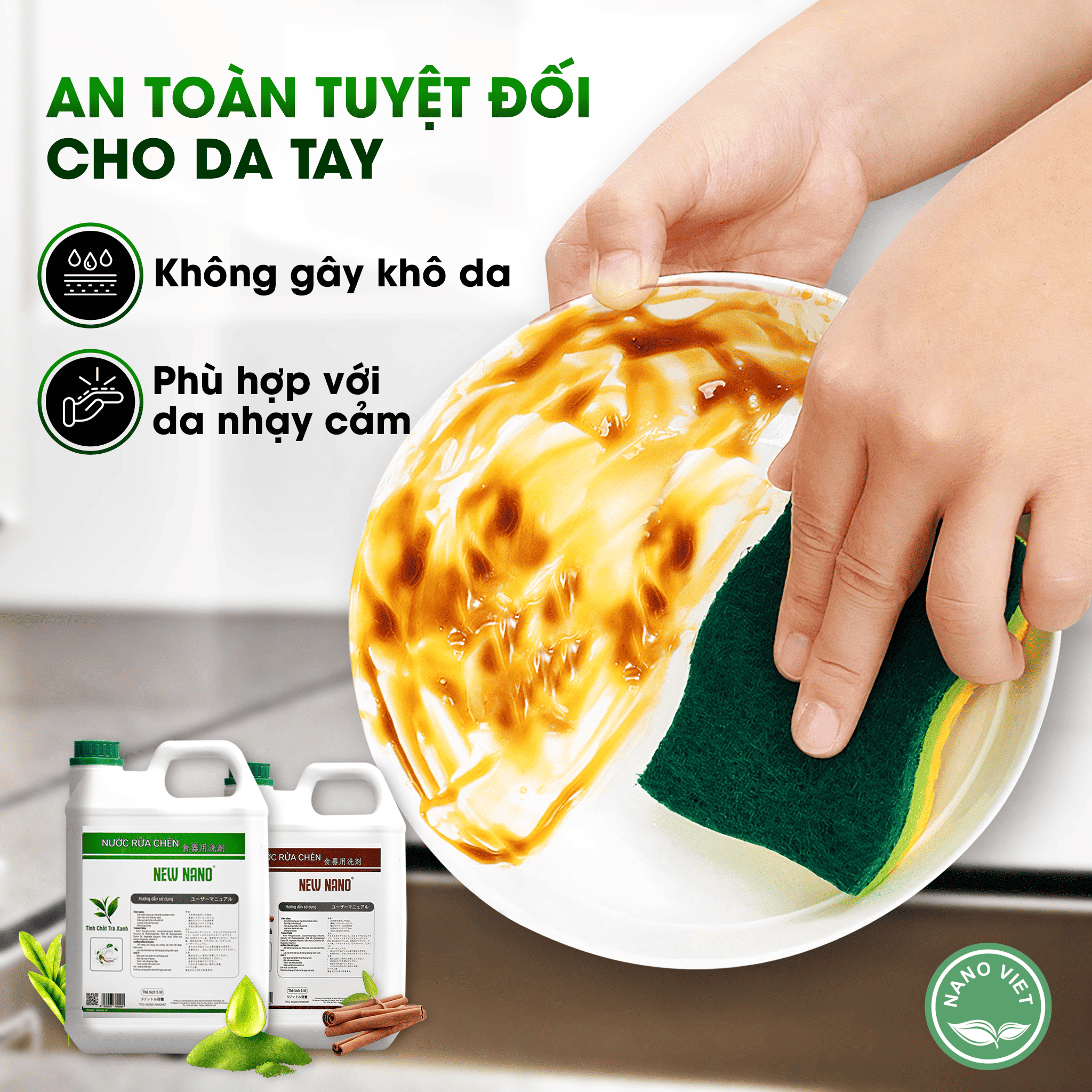 Nước rửa chén New Nano được sản xuất từ các thành phần thiên nhiên, an toàn cho người sử dụng và thân thiện với môi trường, đặc biệt không gây hại da tay